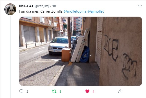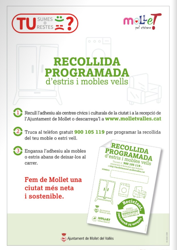 Fa uns dies vam sol·licitar a la 1a Tinenta d’Alcalde, Mireia Dionisio, incloure un punt número quatre, on s’informi els veïns i veïnes que utilitzar el servei gratuït de recollida de mobles i estris vells tindrà beneficis fiscals, tal com es va plantejar en la moció que va portar al Ple Municipal Podemos-Mollet a proposta de Molletopina.