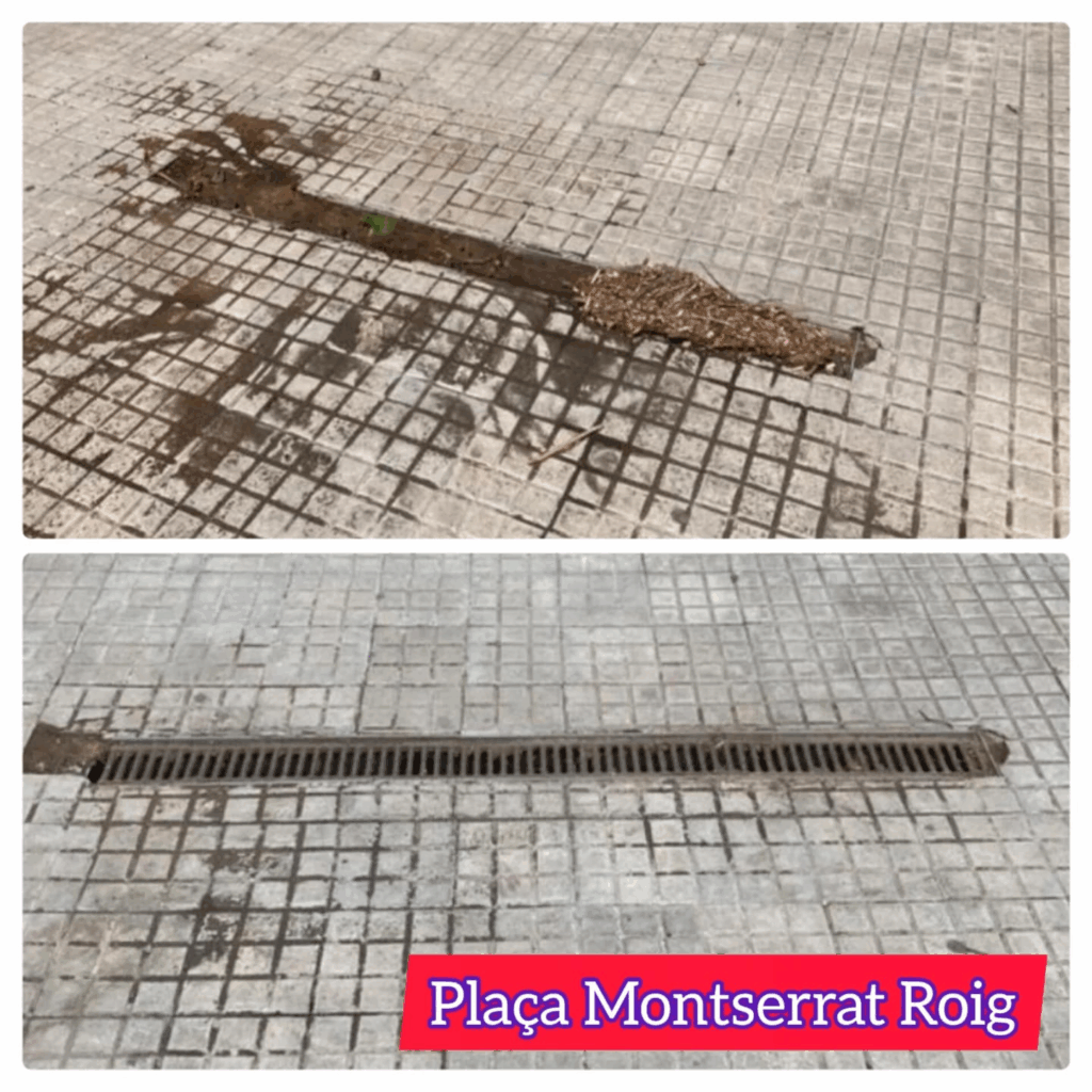 ✅ La veïna del barri, Rosana, ens va fer saber que hi havia acumulació de sorra en una reixa de desguàs a la plaça Montserrat Roig, la qual dificultava el correcte drenatge de l’aigua.