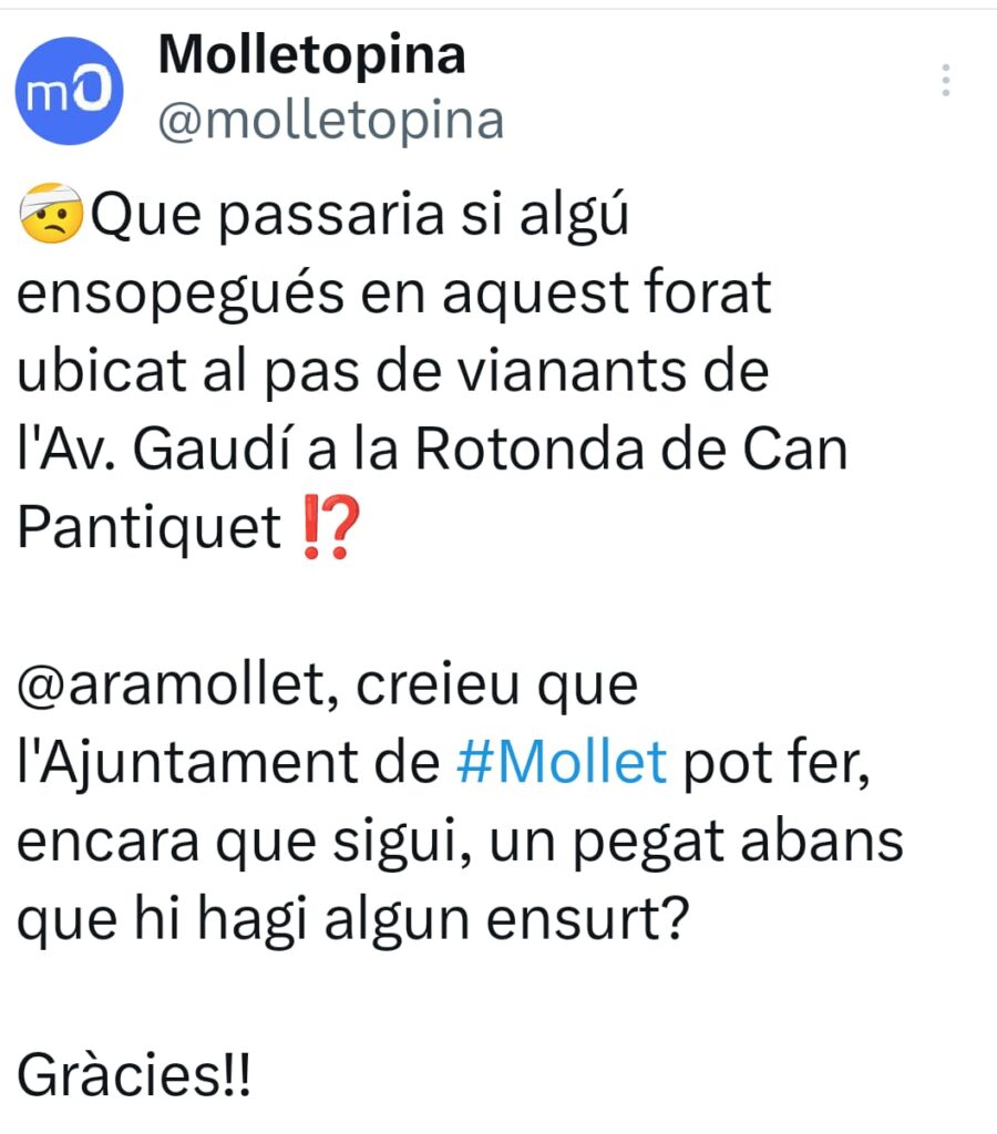✅ Després de 7 mesos d’espera, l’Ajuntament de Mollet ha optat per posar un pegat de ciment a l’Av. Gaudí, prop de la rotonda de Can Pantiquet. Aquesta actuació arriba després de la gestió del grup municipal Ara Mollet – ERC – EUiA, mitjançant el regidor Sergi Suárez. La petició la va fer l’Iván G., i Molletopina n’ha fet el seguiment fins a la seva resolució. Tot i la millora, els veïns esperen una solució definitiva per al paviment de la zona.