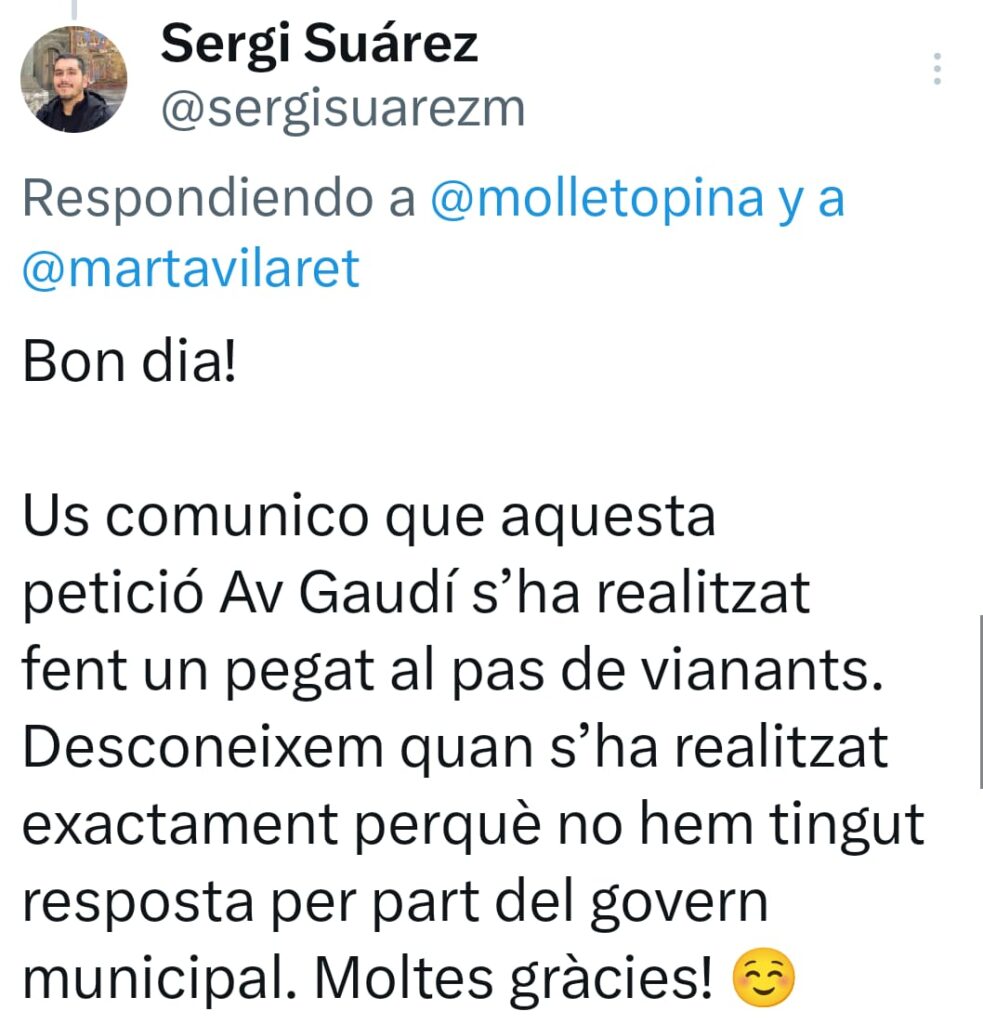 Volem agrair al regidor Sergi Suárez la seva gran dedicació al costat de Molletopina per fer seguiment de les peticions veïnals que ens feu arribar. És curiós com, tot i que des del govern municipal es demana a l’oposició que col·labori per millorar Mollet, quan el regidor Suárez envia correus amb demandes ciutadanes, el regidor de Via Pública només respon el darrer dilluns de cada mes, just abans del ple municipal. Una pràctica que no deixa en bon lloc ni la seva gestió ni la imatge de Mollet. Així ho veiem des de Molletopina.
