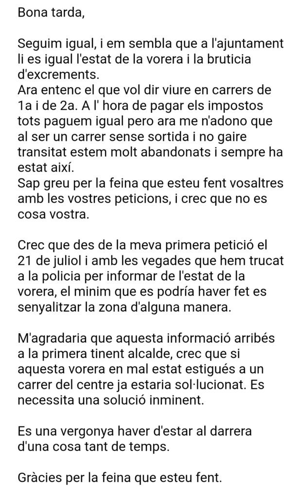 Aquest és el correu que ens va enviar la veïna i en el qual ens indica que ha avisat fins i tot a la policia municipal.