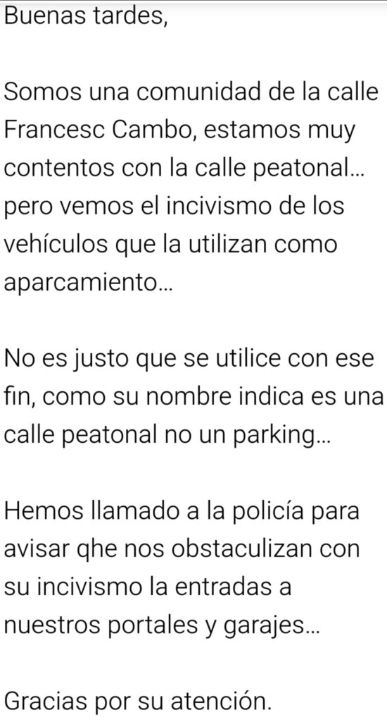 ✅ Volem agrair la confiança d’una veïna que, en nom de la seva comunitat, ens va traslladar el problema de l’accés indegut de vehicles a la zona de vianants de Francesc Cambó. La sol·licitud es va gestionar directament amb l’alcaldessa, Mireia Dionisio, qui molt amablement ens va donar feedback i va ordenar solucionar-ho. Actualment, no sabem si la situació ha millorat, però valorem la proximitat i predisposició de l’alcaldessa per atendre i resoldre aquestes qüestions veïnals.